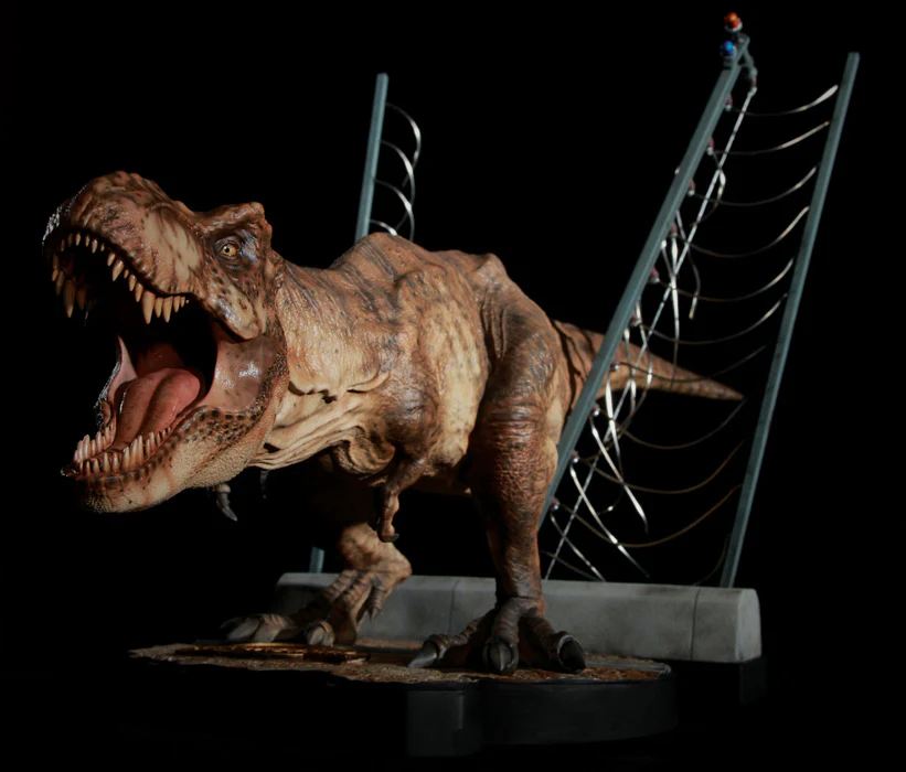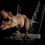 This 1/20th scale statue features the female T-Rex as she roars in triumph after setting herself free from her pen. The base shape is inspired by the T-Rex pen on the map of the park and includes fence posts with what is left of the electrified cables. The lights on top do not light up on this model, because when she breaks free, the power is out.
