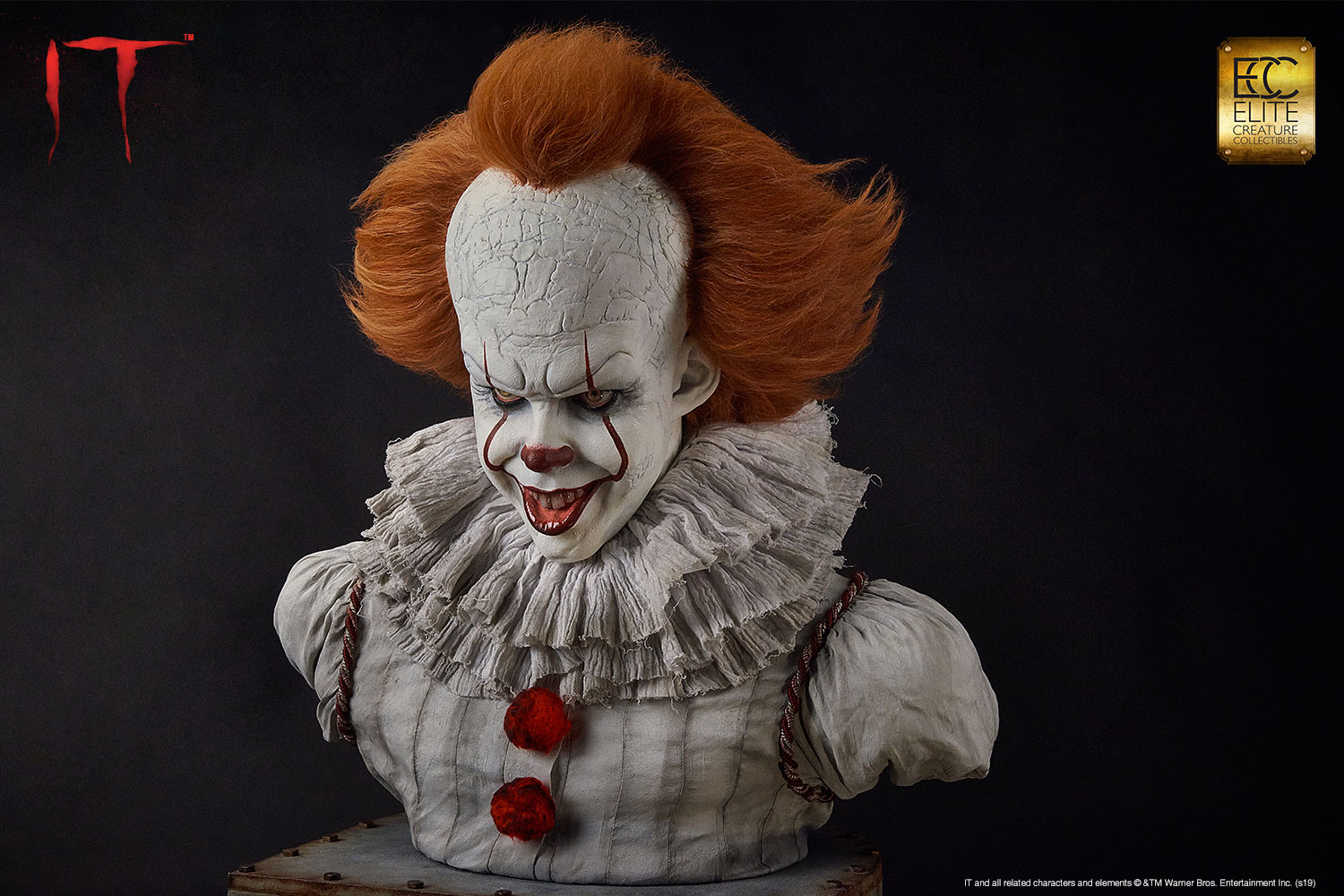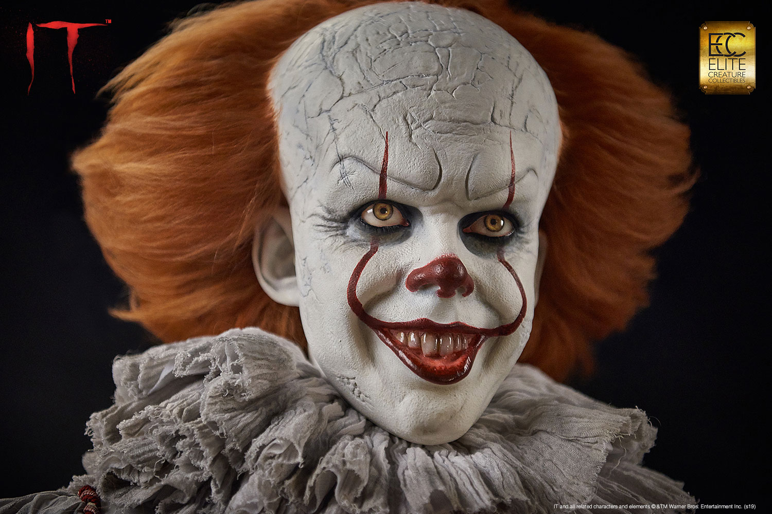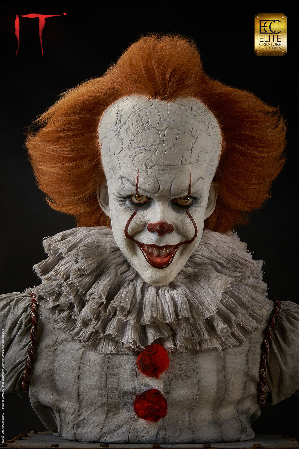 Elite Creature Collectibles is proud to introduce our museum-quality Pennywise bust from the movie IT based on the 1986 novel of the same name by Stephen King. This iconic villain is perfectly sculpted by legendary Hollywood makeup effects sculptor Mitch Devane, whose credits include the The Nutty Professor, Nightmare on Elm Street3: Dream Warrior, Tim Burton’s Planet of the Apes, Mighty Joe Young and Bram Stoker’s Dracula.