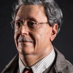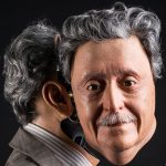 Translucent resin face, custom hair, hand tied mustache, and glass eyes.