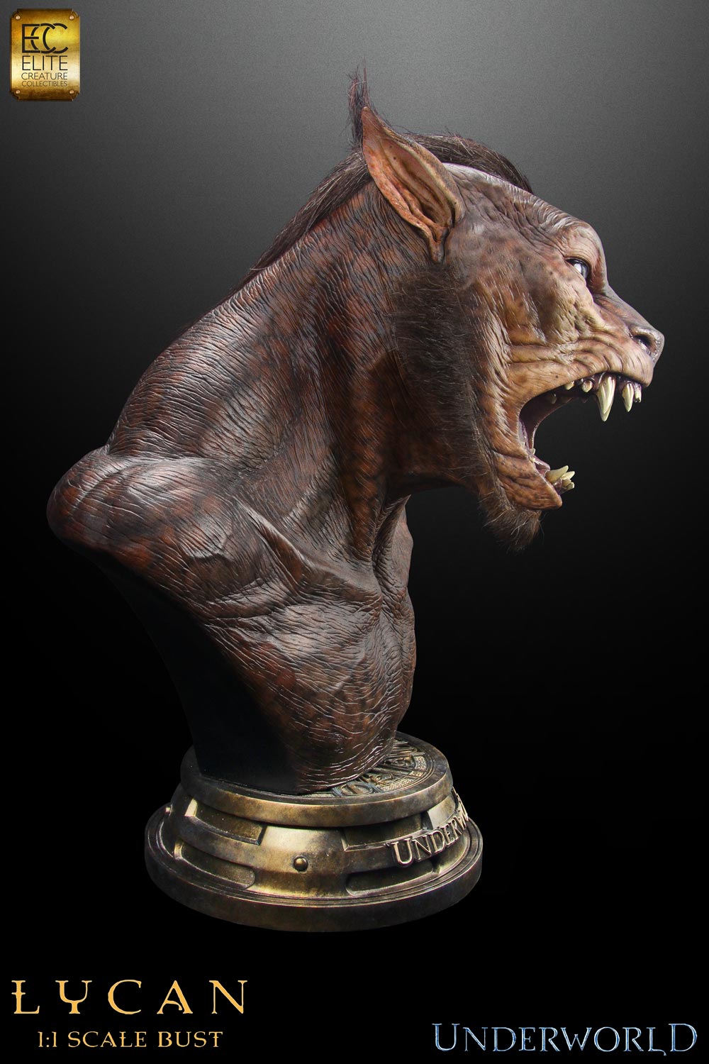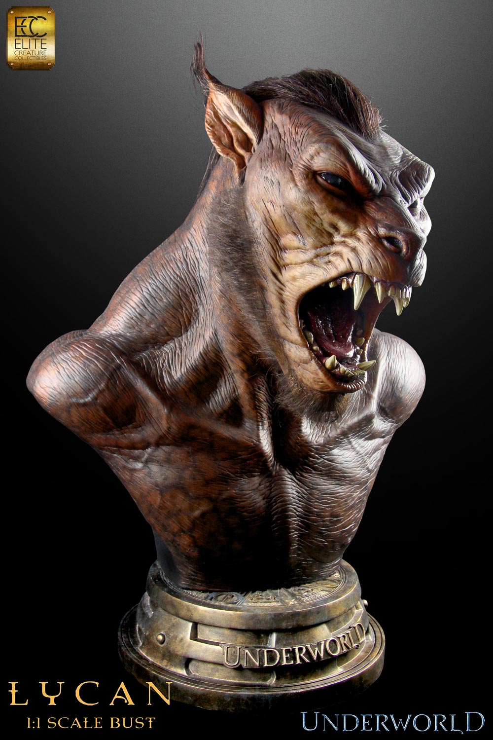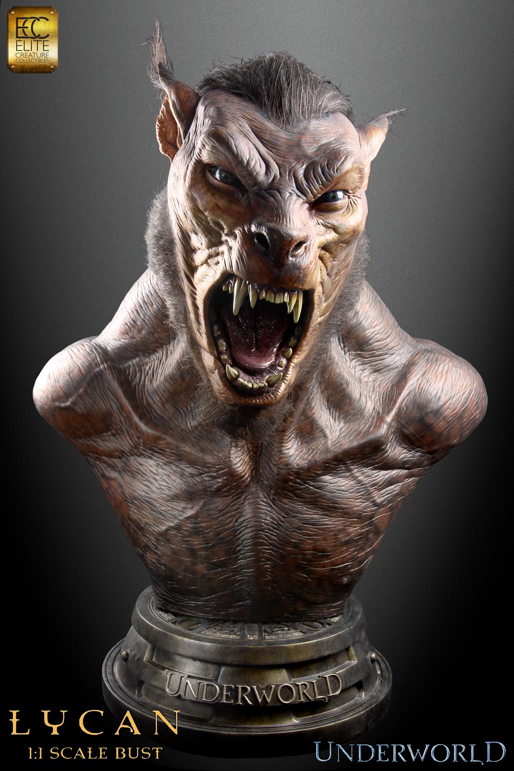 Elite Creature Collectibles is delighted to announce its 1:1 scale Lycan bust from the first Underworld film. Intricately detailed, this statue stands an imposing 30 inches tall and captures perfectly all the ferocity of these creatures. This museum quality bust is constructed from heavyweight polystone, then individually hand painted to the finest detail. Each bust also comes with custom fur used in the original film made by the same USA FX supplier!Werewolves are like whiskey, they get stronger with age and are harder to down. Be wild and don’t get drunk!