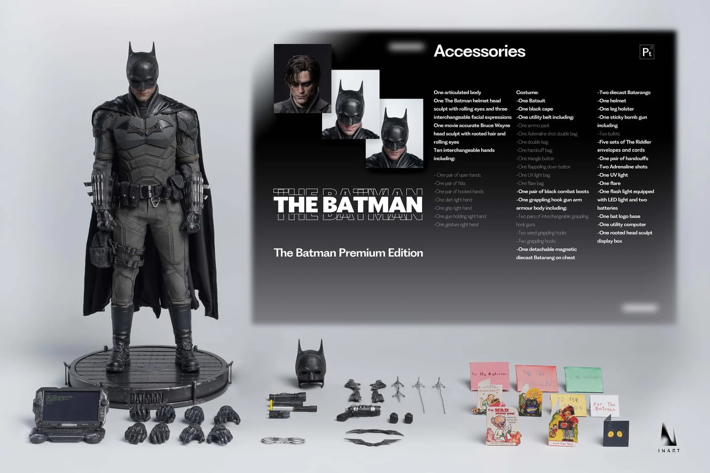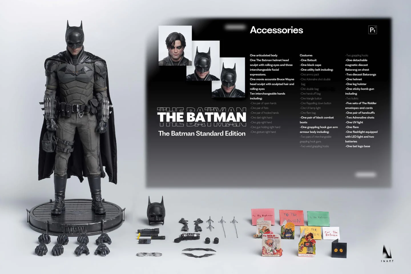 This 1/6 collectible INART The Batman and Bruce Wayne figure is a movie accurate depiction of Robert Pattinson as The Batman and Bruce Wayne from the critically acclaimed 2022 film. Carefully crafted, using the finest materials, the team have captured Pattinson’s likeness with stunning accuracy, with both a sculpted and “rooted hair” option. Both The Batman and Bruce Wayne figures come with all of the essential accessories you need for posing. With 5 editions available, so you can order what’s right for your display and budget. Lucky collectors can also pick up The Batman’s Bat-Logo which can be ordered separately