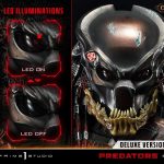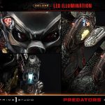 Standing at a whopping 39 inches, the talented artists at Prime 1 Studio have worked hard to make that murderous mastermind look amazing in polystone form. From the large domed breathing mask alone, you already know he means business because of the protruding bony jaw and teeth at the bottom. You can expand your storytelling with a swappable head part, showing his true face, baring his mightiest, most hideous, and ghastliest grimace. You could spend hours upon hours just taking in all the intricate detailing on the head tendrils, spikes, scaly skins and sparse armor this cunning hunter possesses. And what would a predator be without his impressive array of ranged and wristblade. With closed fists, the Yautja is armed with his wristblade extended on his right arm. LEDs are equipped in the helmet-mounted Targeting Laser, the left arm’s wrist control panel gauntlet, and the plasmacaster over the shoulder. A headstand is also included for you to display the additional head.